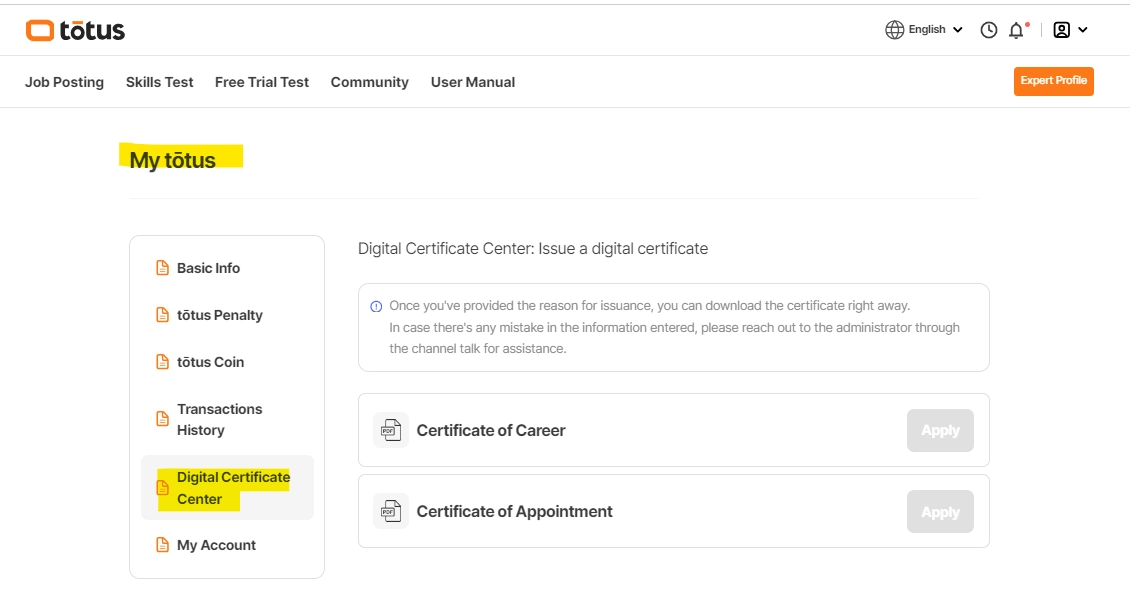 Route: tōtus Homepage > Profile Icon on the top right > My tōtus > Digital Certificate Center
