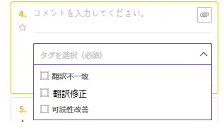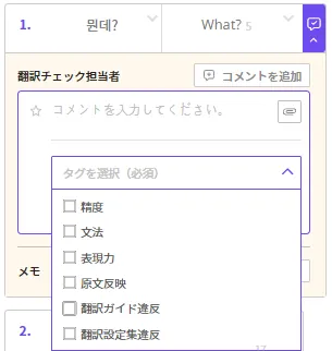 コメント:フィードバックのこと。チェッカーまたはQAがエラータイプを指定し、翻訳・写植などを担当する作業者に改善してほしいポイントを伝えます。