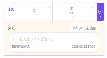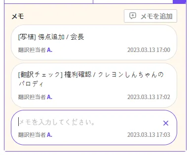 [メモを追加]をクリックして複数個のメモを作成することができ、写植担当者と翻訳チェッカーへのメモを個別に作成することも可能です。