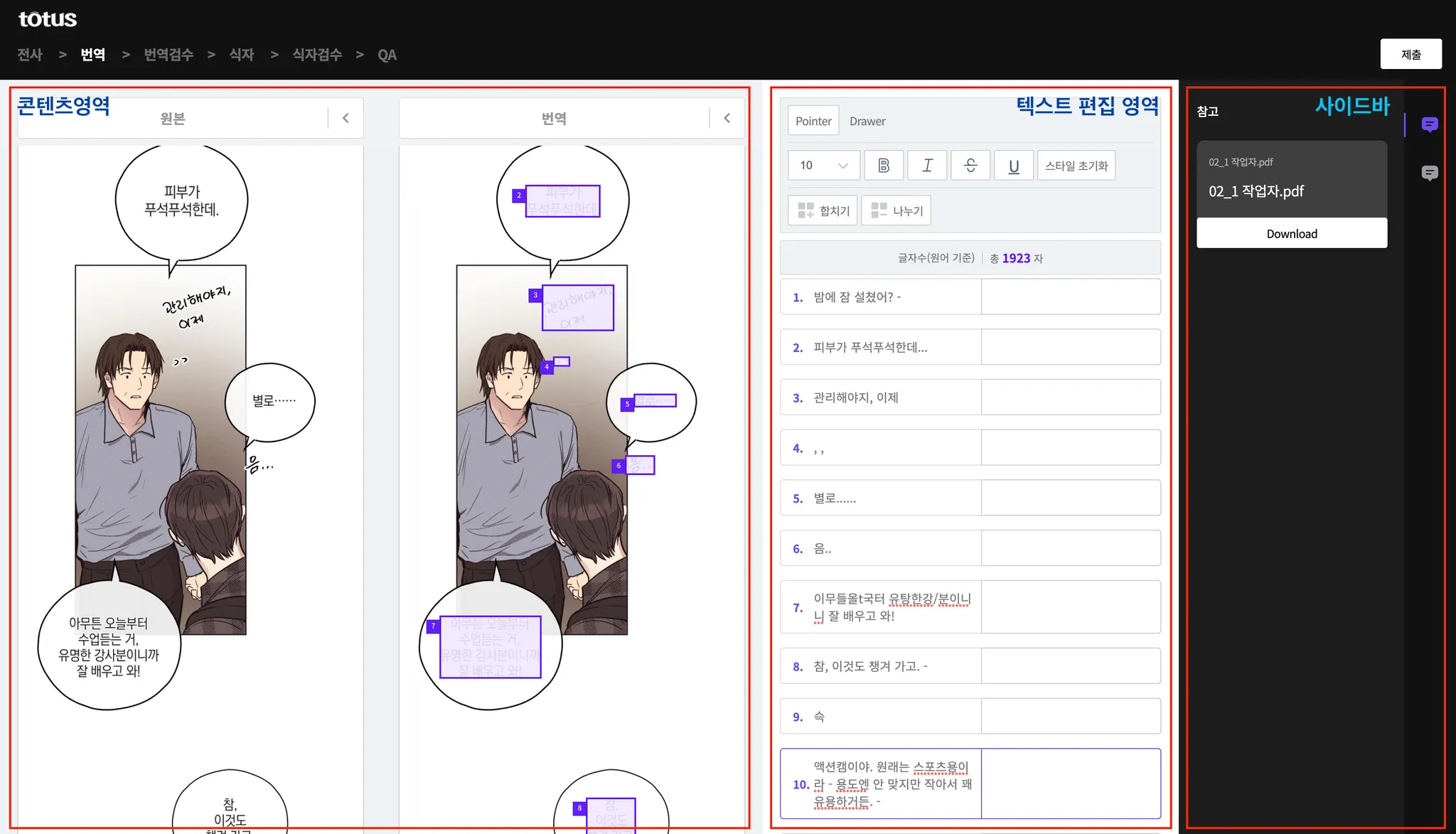 번역 에디터는 콘텐츠 영역, 텍스트 편집 영역, 사이드바로 이루어져 있습니다.