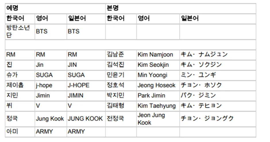 방탄소년단은 BTS로만 표기한다. (防弾少年団 지양)