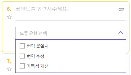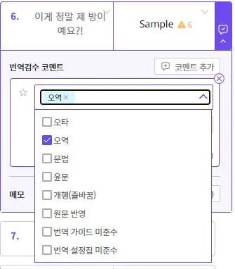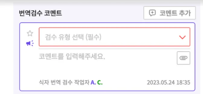 코멘트: 기존의 피드백. 번역자, 식자 등 작업 담당자가 향후 주의해야 할 사항으로, 검수자/QA가 오류 유형을 지정해서 기입합니다.