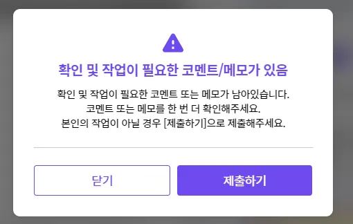 제출 시 확인/처리되지 않은 태그 메모가 있을 시 알림창이 뜹니다.