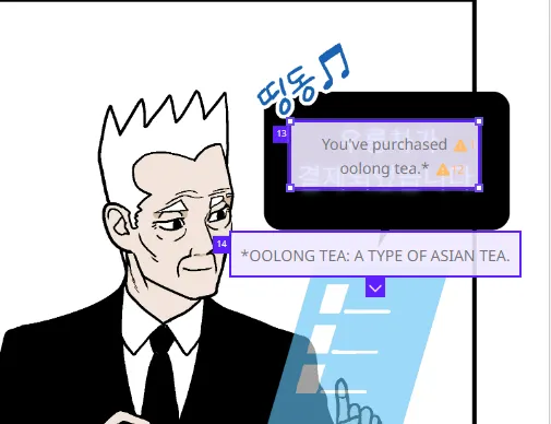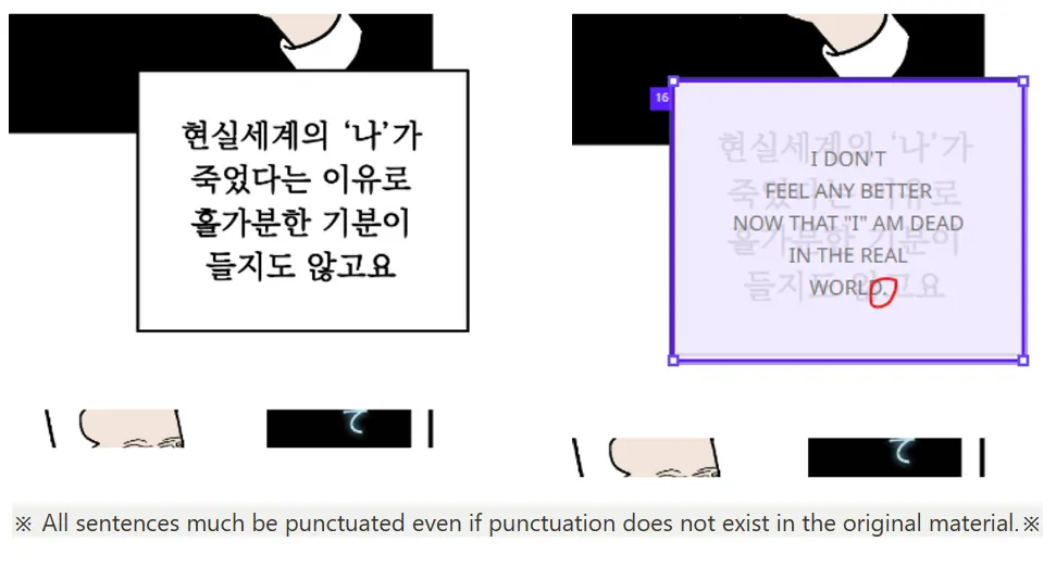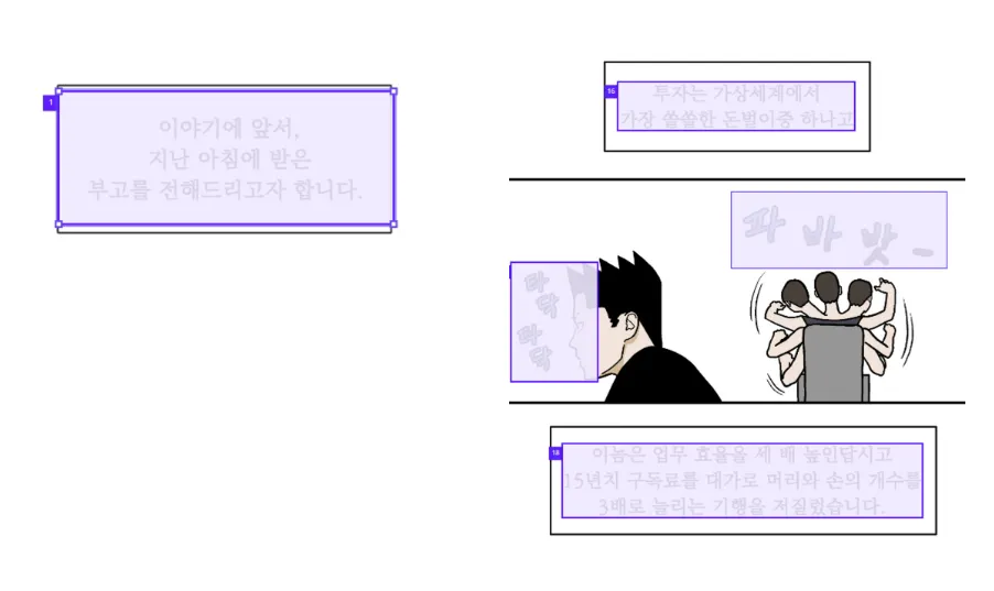 (2) Text boxes should be created for all Korean texts, including signs and SMS in the background.