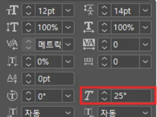 이 때 기울기 값은 폰트마다 가독성을 고려해 설정하며, 이 값은 반드시 폰트 설정집의 ‘생각 폰트’ 란에 기재해주세요. (전 화차에서 동일한 값으로 적용되어야 합니다.)