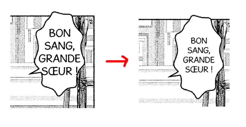 번역문에 비해 말풍선이 작아 번역문이 다 들어가지 않을 경우 폰트의 크기를 줄여 말풍선 안에 완전히 들어갈 수 있게 합니다.