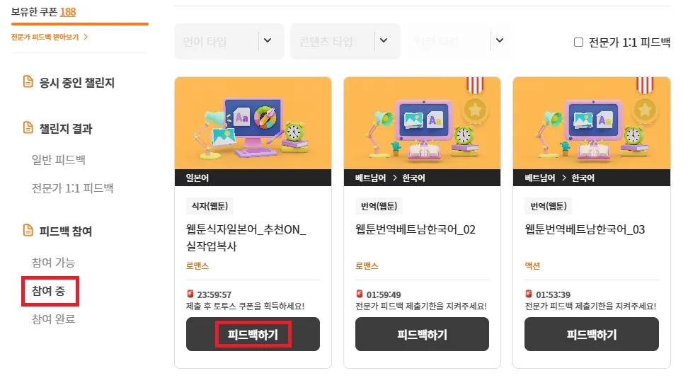 [마이 챌린지] → [피드백 참여] → [참여 중]에서 피드백 중인 챌린지를 관리하고, 마감 시간 이전에 제출해보세요