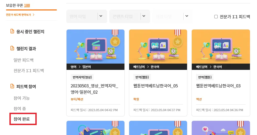 [마이 챌린지] → [피드백 참여] → [참여 완료]에서 완료한 피드백 내역을 확인할 수 있습니다