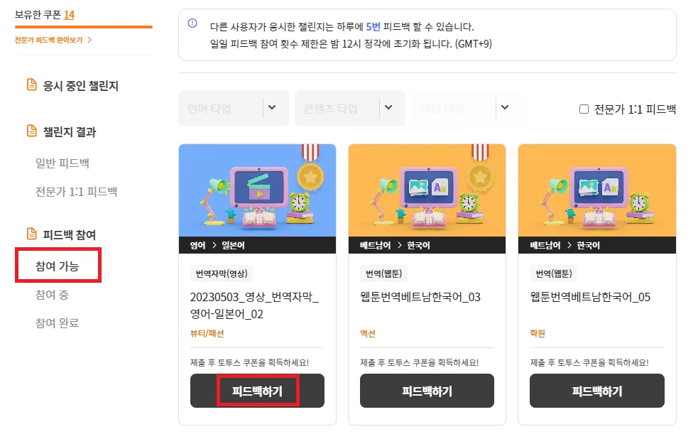 [마이 챌린지] → [피드백 참여] → [참여 가능]에서 원하는 챌린지를 평가해보세요