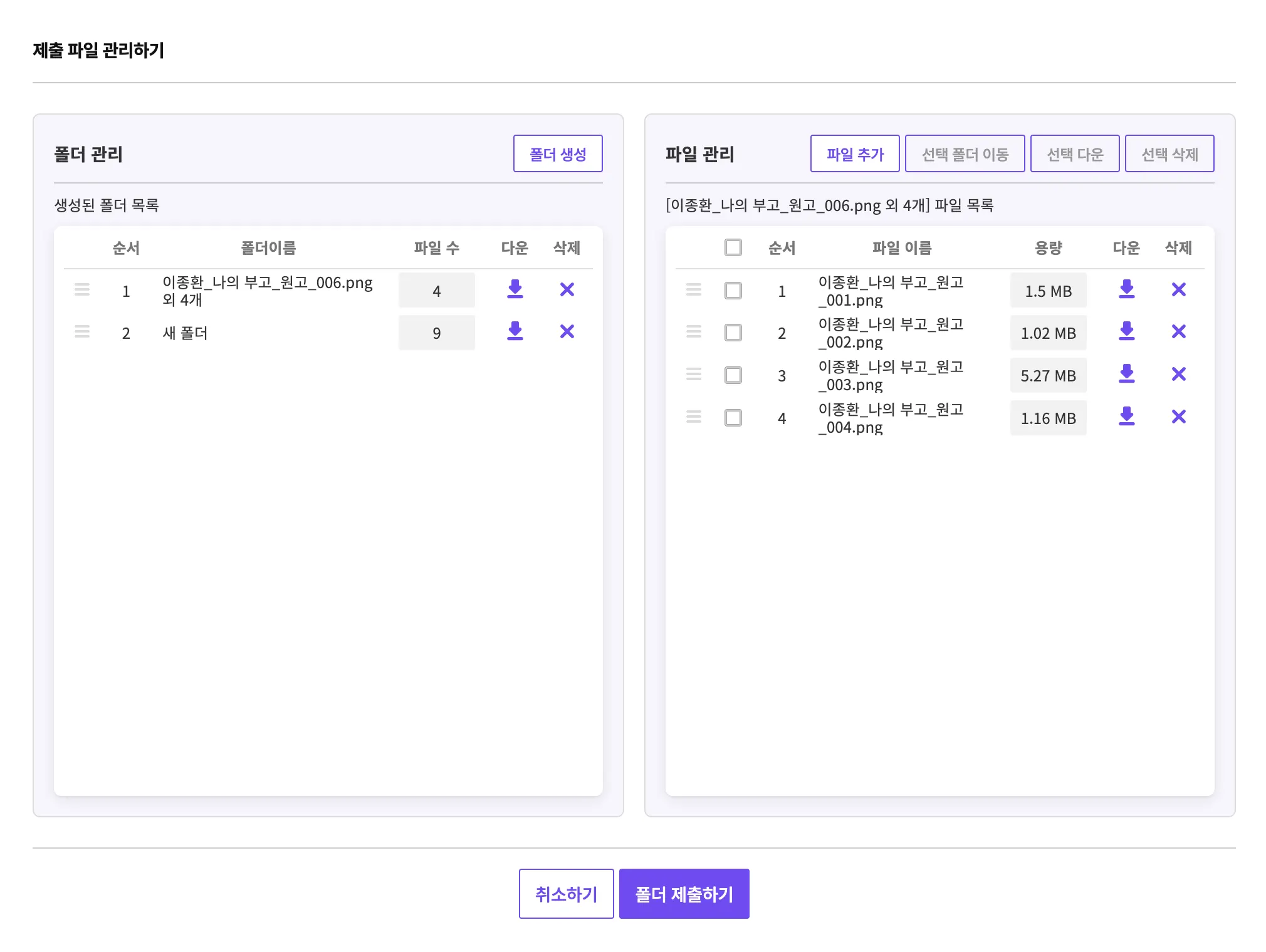 [업로드 파일 관리]에서의 모든 수정사항은 [폴더 제출하기]를 클릭해야 반영됩니다.
