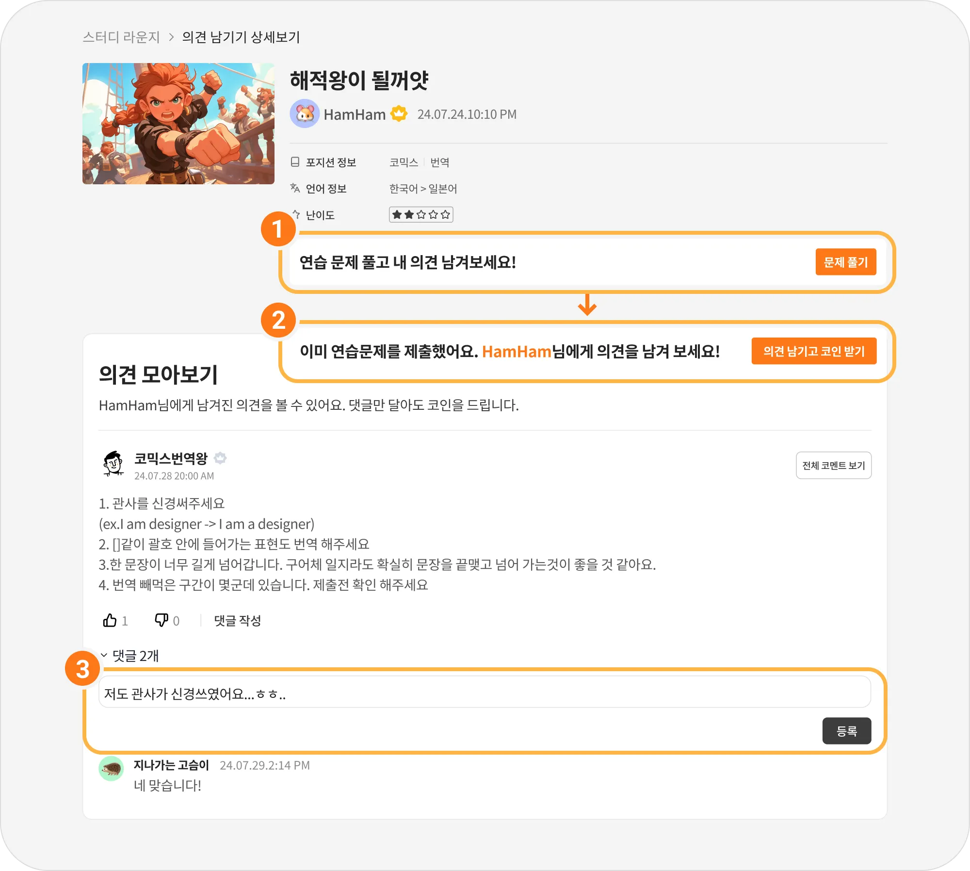 다른 사람에게 의견을 남길 때마다 3,000코인 씩 지급됩니다.