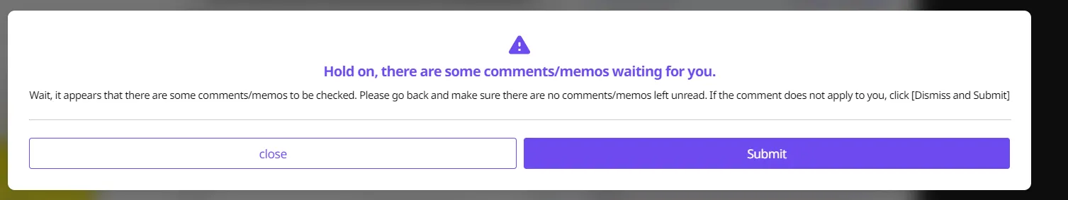 If there are tagged memos that have not been checked and dealt with, you will get an alert upon submission