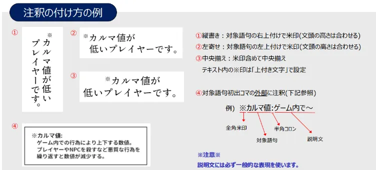 出現頻度が高かったり、ストーリーに必ず必要な場合は、脚注/注釈をつけます。
