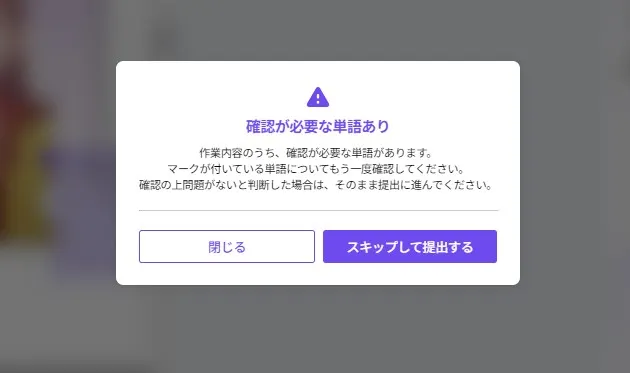 右上の[提出]をクリックすると、エディタ内のスペル/文法チェッカーが品質確認を行います。ハイライトされた部分を再度検討することでミスの発見率を高めることができます。