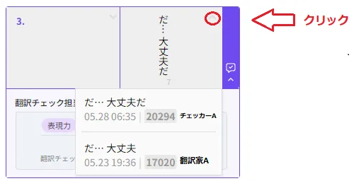 校閲後、自身が翻訳した内容を確認したい場合には”^”をクリックで確認可能。