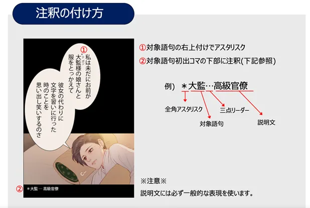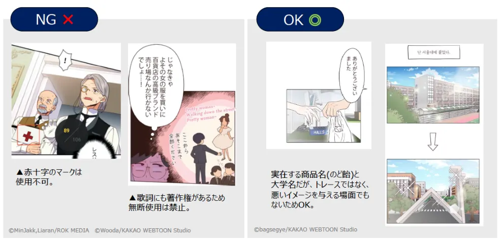 日本で既に出版された小説等の著作物の場合、版権社が異なることがありますので、そのまま使えません。日本で出版されたWebtoonの原作小説のセリフの一部をそのまま使用する場合はPMへとお知らせください。(メモへも記載)