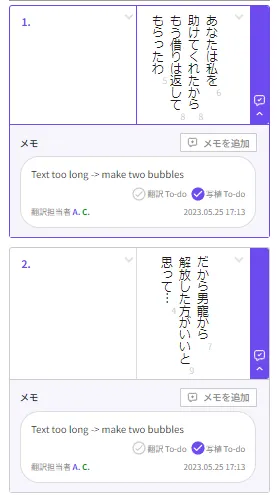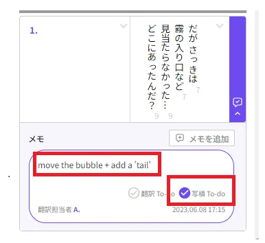 メモへ”move the bubble + add a 'tail’”と記載後、写植To-doへチェック