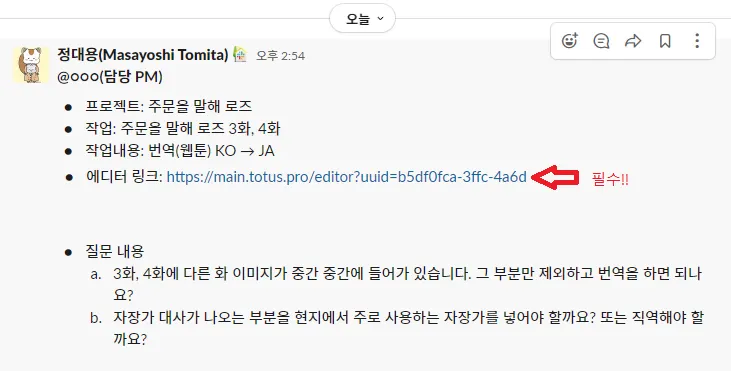 토투스 작업 관련된 내용은 기본적으로 Slack(슬랙)으로 소통합니다.