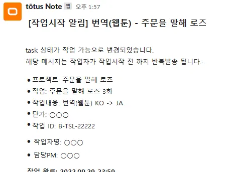 슬랙 알림 예시 이미지 (실작업이 아닌 예시로 작성되었습니다.)