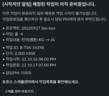 이전 단계 작업 미완료 등 작업가 분께 배정된 작업이 예정 일자에 시작하지 못하면 알림이 발송됩니다.