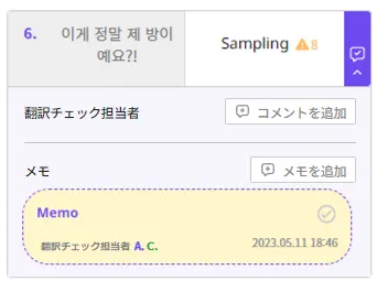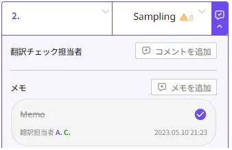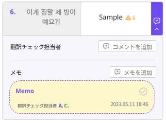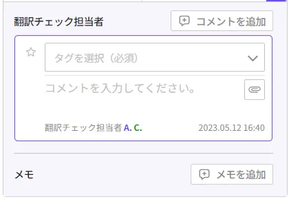 [メモを追加]をクリックして複数個のメモを作成することができ、写植担当者と翻訳チェッカーへのメモを個別に作成することも可能です。
