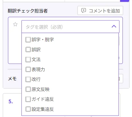 コメント:フィードバックのこと。チェッカーまたはQAがエラータイプを指定し、翻訳・写植などを担当する作業者に改善してほしいポイントを伝えます。