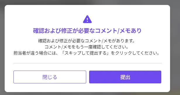 提出の際に確認・処理されていないメモがある場合は以下のようなポップアップが表示されます。