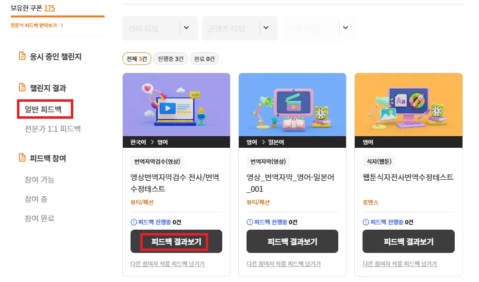 ★[마이 챌린지] → [챌린지 결과] → [전문가 1:1 피드백] 에서 전문가 1:1 피드백 내용을 확인할 수 있어요