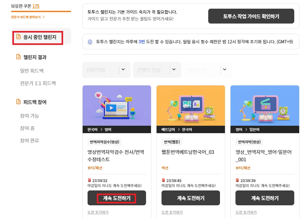 [마이 챌린지] → [응시 중인 챌린지]에서 응시 중인 챌린지를 관리하고, 마감 시간을 관리하세요