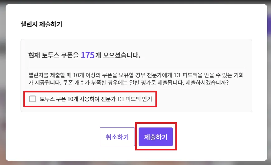 검증된 전문가로부터 1:1 피드백을 받고 싶다면 토투스 쿠폰을 사용하여 전문가 1:1 피드백을 요청해야 합니다.