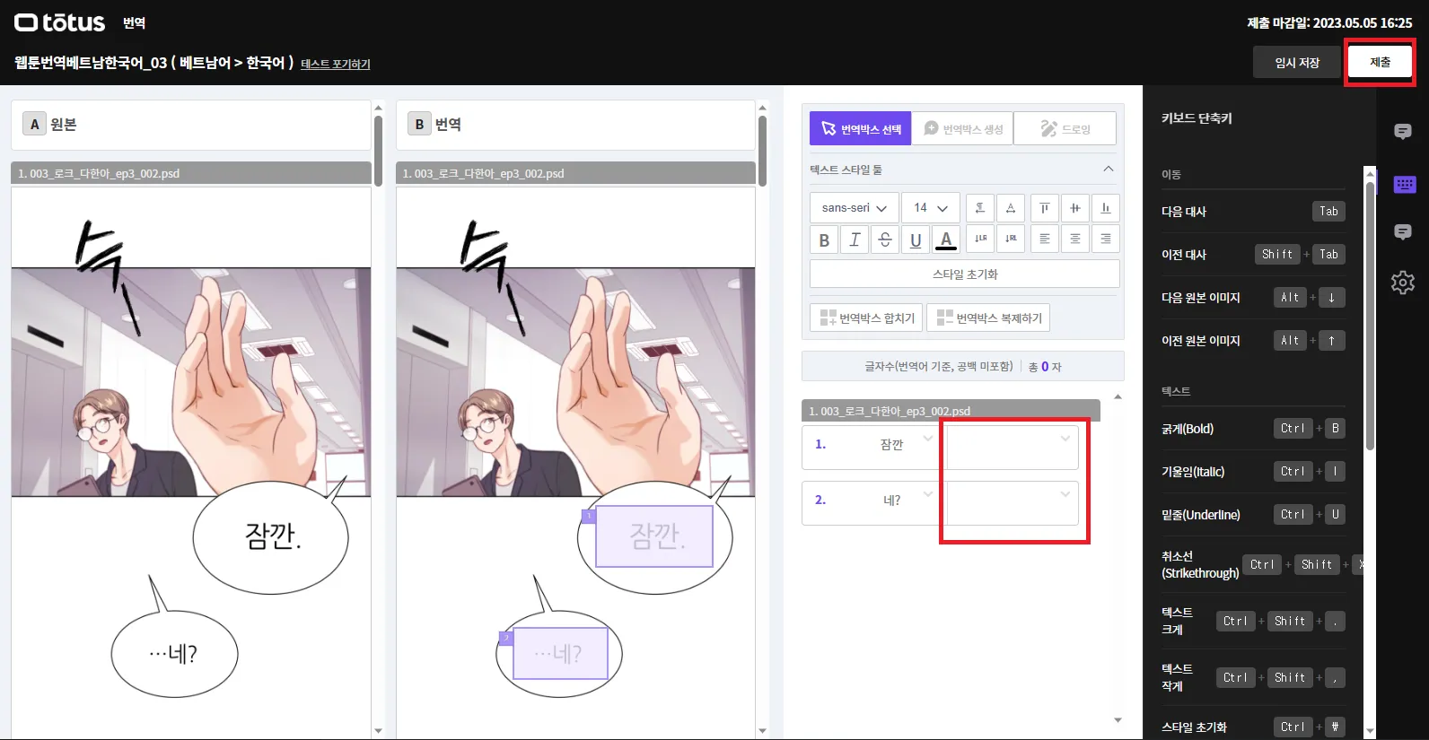 [토투스 에디터]에서 번역 및 식자 작업을 수행하고 우측 상단 “제출” 버튼을 눌러 챌린지를 제출하세요