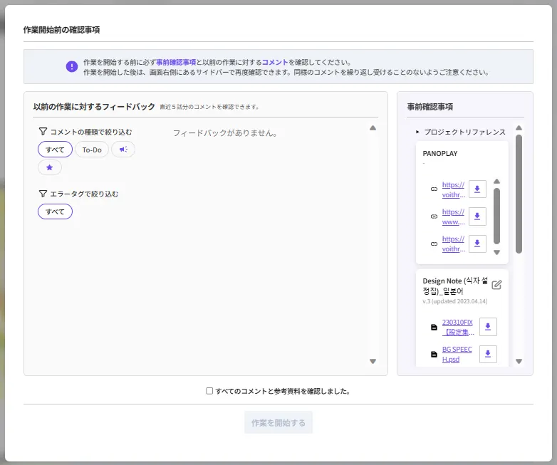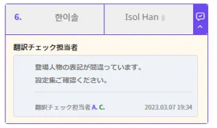 コメント:フィードバックのこと。チェッカーまたはQAがエラータイプを指定し、翻訳・写植などを担当する作業者に改善してほしいポイントを伝えます。