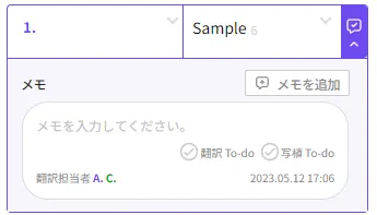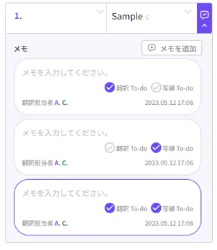 [メモを追加]をクリックして複数個のメモを作成することができ、写植担当者と翻訳チェッカーへのメモを個別に作成することも可能です。