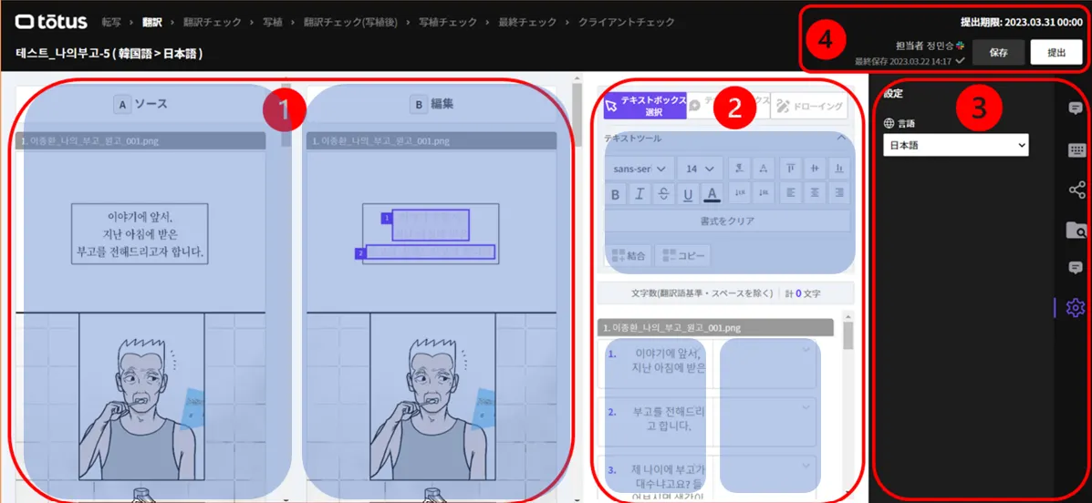② テキストパネル : テキストツール、ソース言語、ターゲット言語