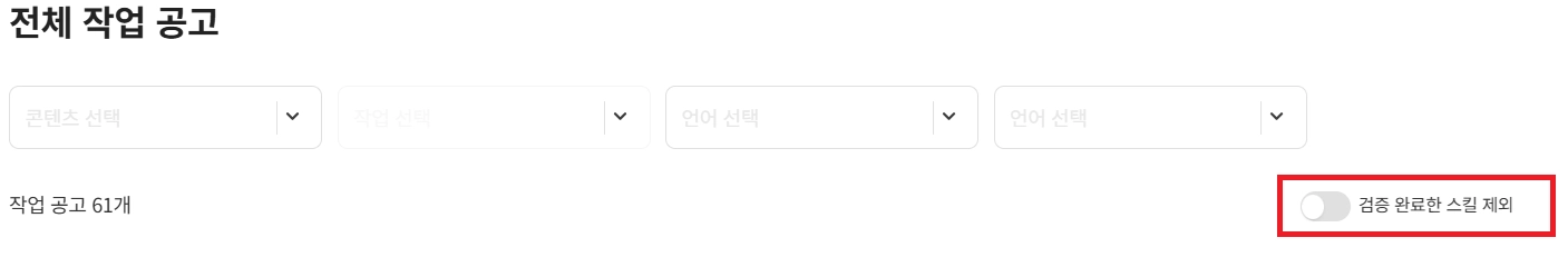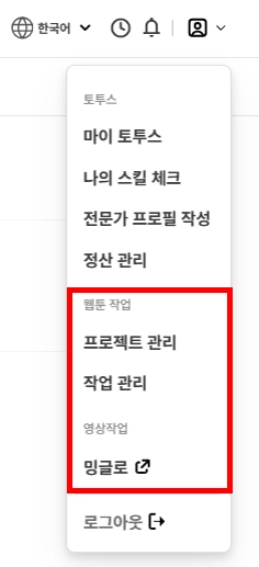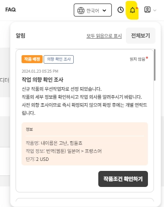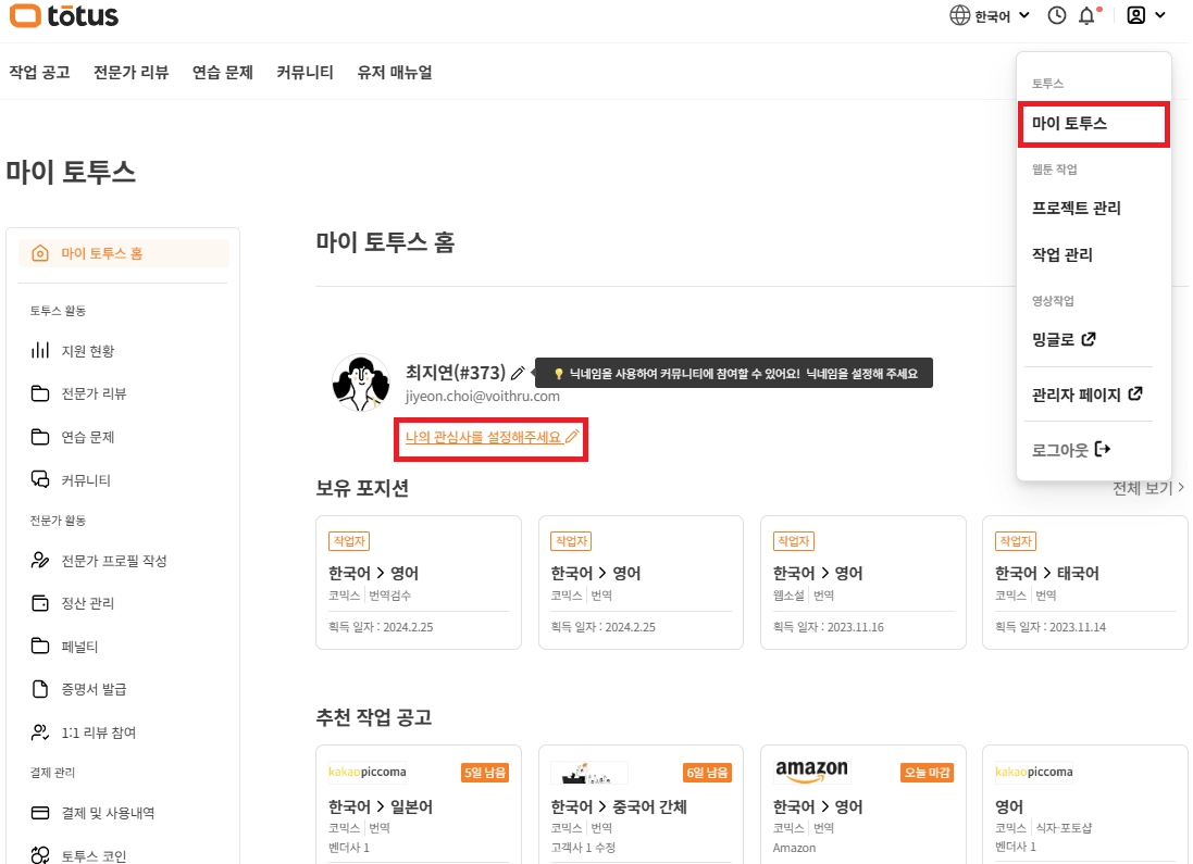 팁 : 내 관심 분야 (예: 한국어>영어 코믹스 번역) 를 설정하면, 그와 관련된 포지션이나 추천 작업 공고를 한눈에 볼 수 있어요!