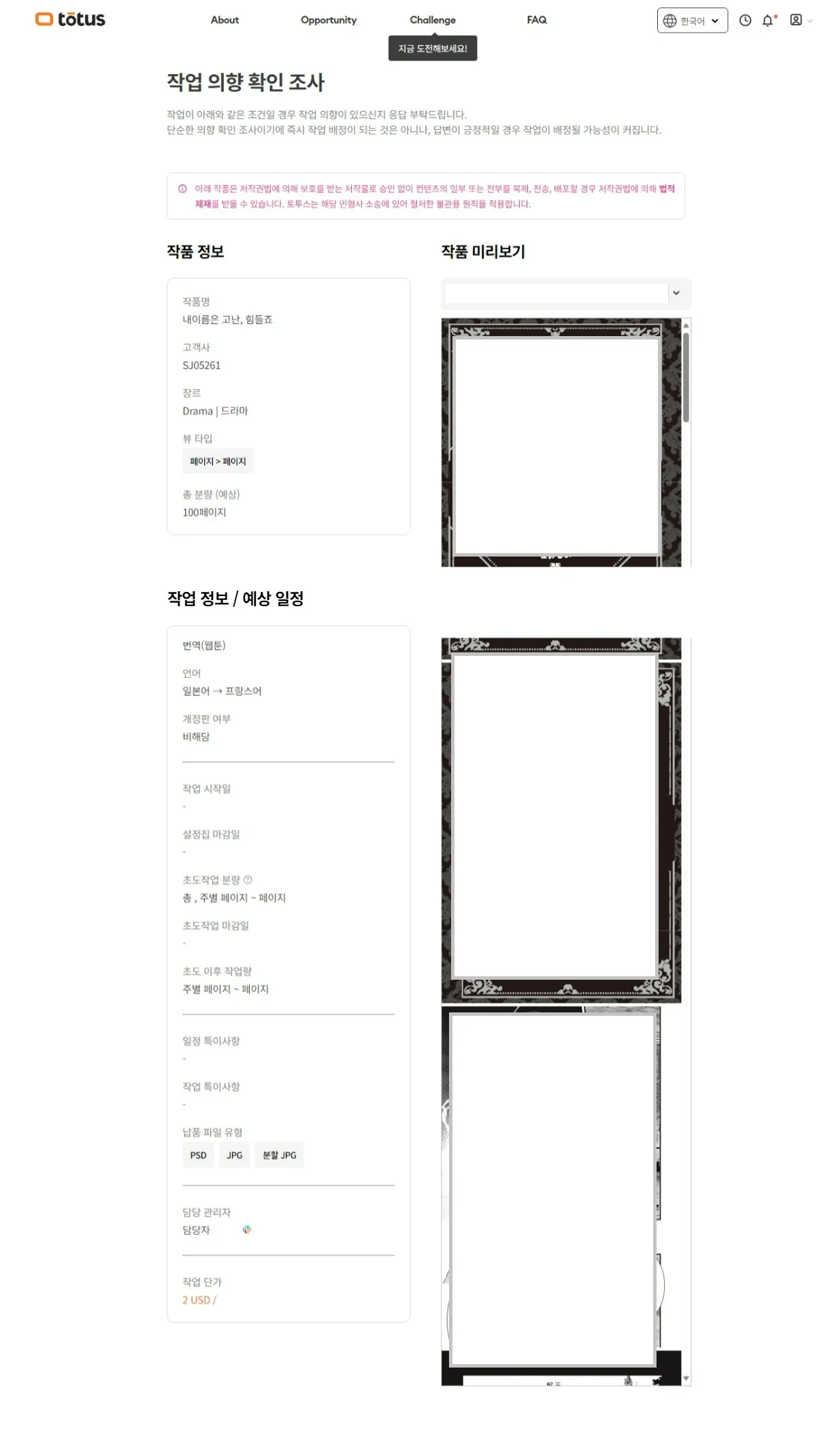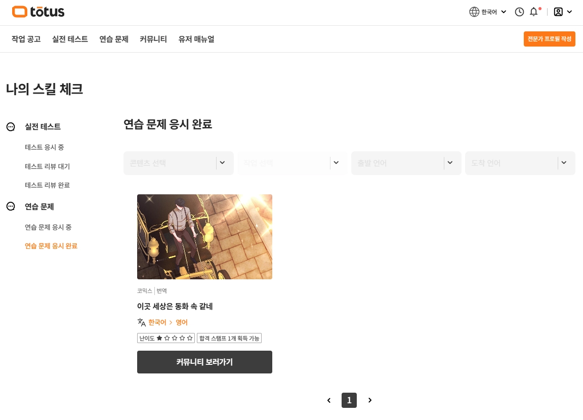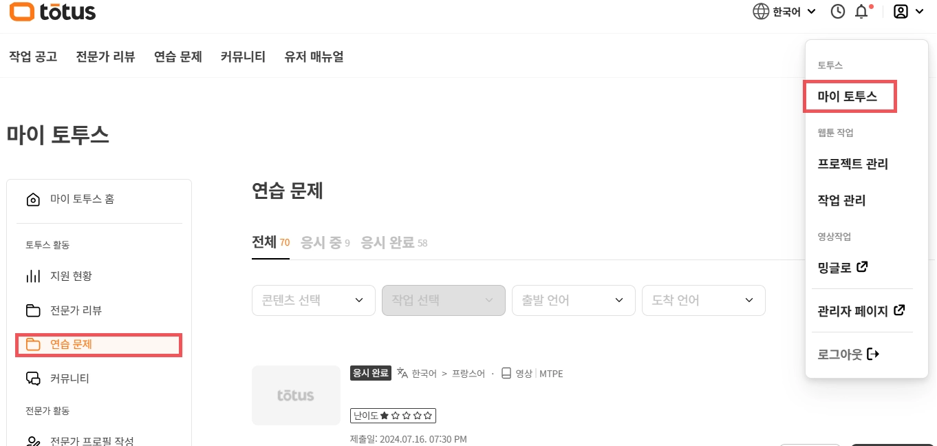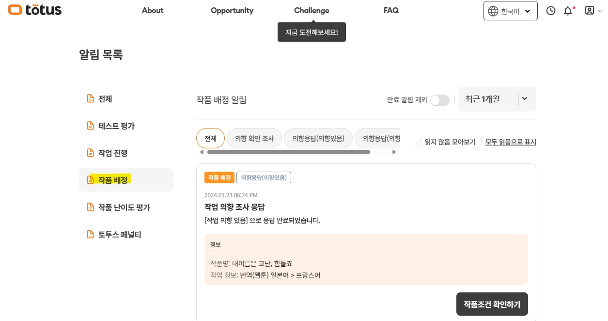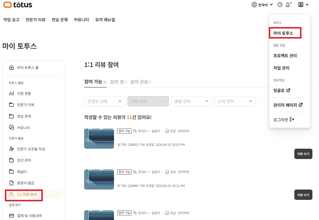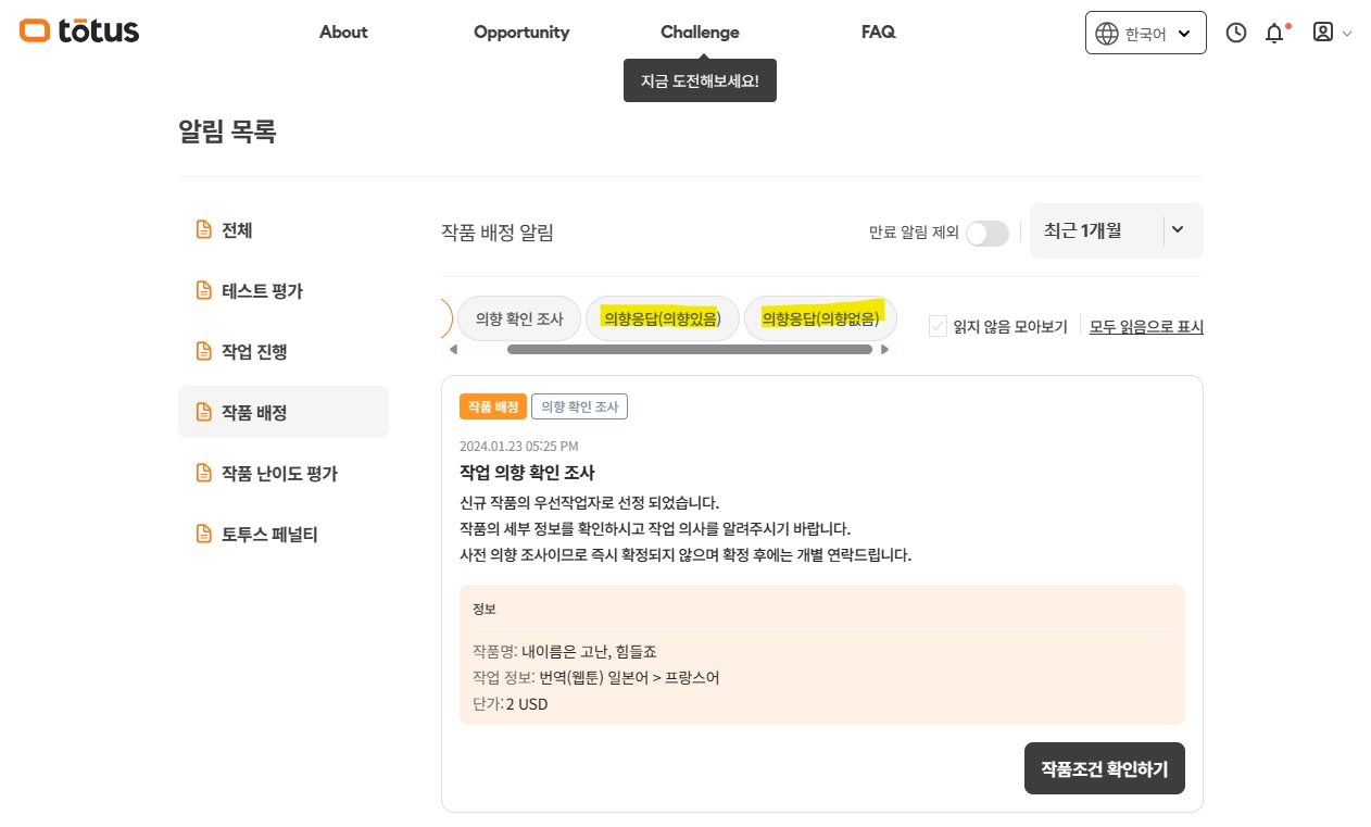 토투스에서 전문 프리랜서로 활동하고 싶으시다면, ‘작업 공고’ 페이지에서 테스트에 통과하여 해당 포지션에 대한 전문성을 검증받으세요.