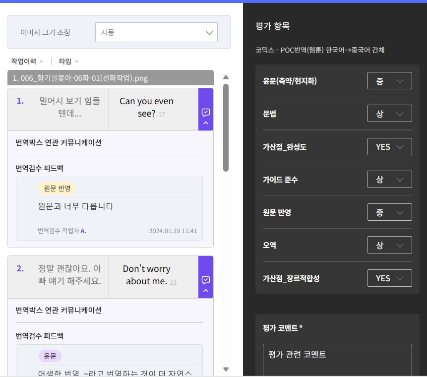 토투스는 월 주기로 납품 전 작업들을 랜덤 샘플링하여 번역기 사용 여부, 작업 시간 등을 토대로 퀄리티를 확인하고 있습니다.