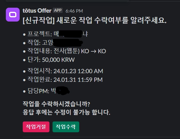 (작업을 수락하시면 실작업 관련 소통 수단인 Slack 에 입장할 수 있는 초대 이메일을 보내드립니다.)