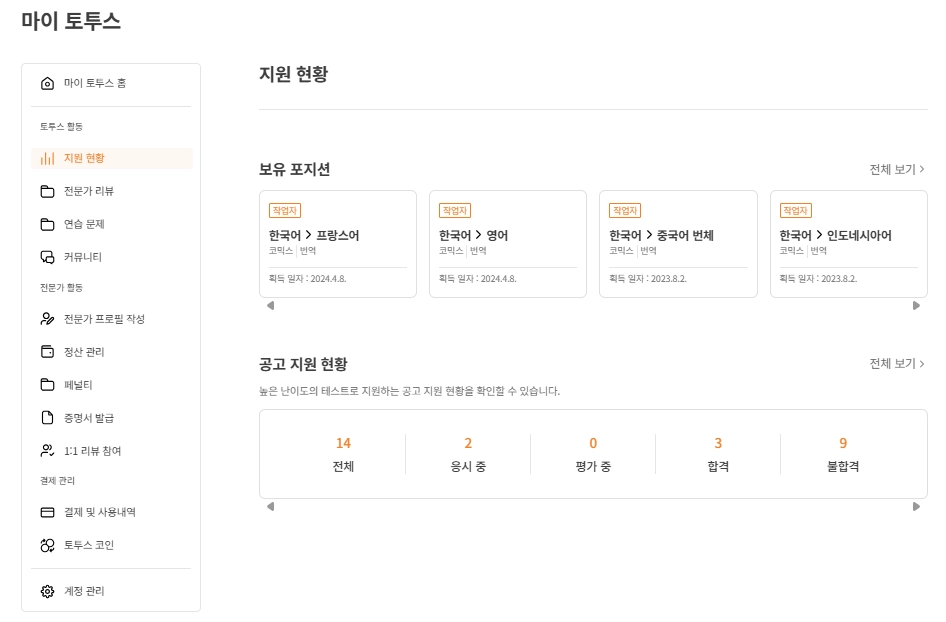 콘텐츠, 언어셋(출발어,도착어)을 선택하여 내가 원하는 포지션만 손쉽게 확인해보세요