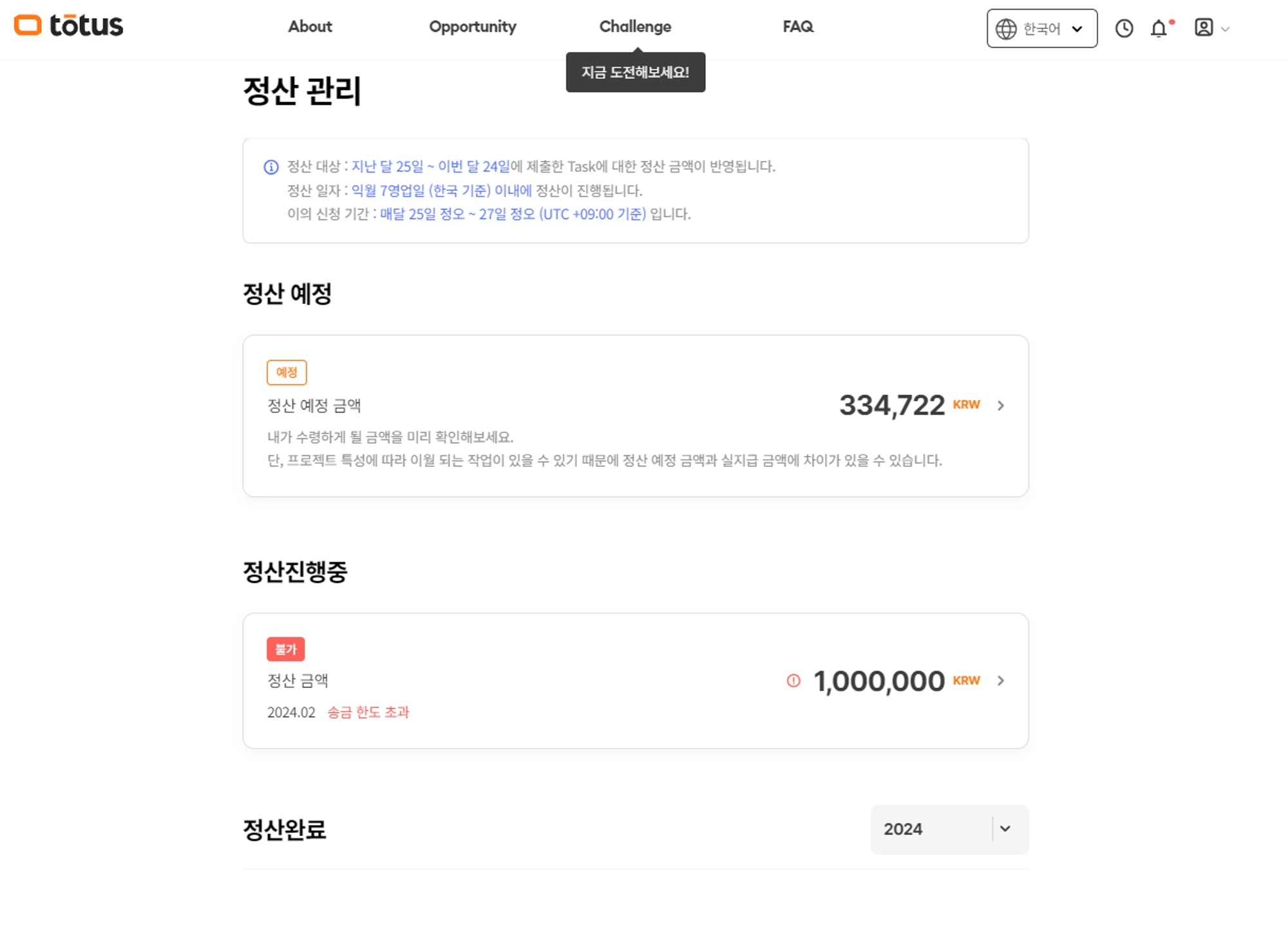지급 불가 금액은 마이 토투스 > 정산 관리 > 정산진행중에 표시됩니다.