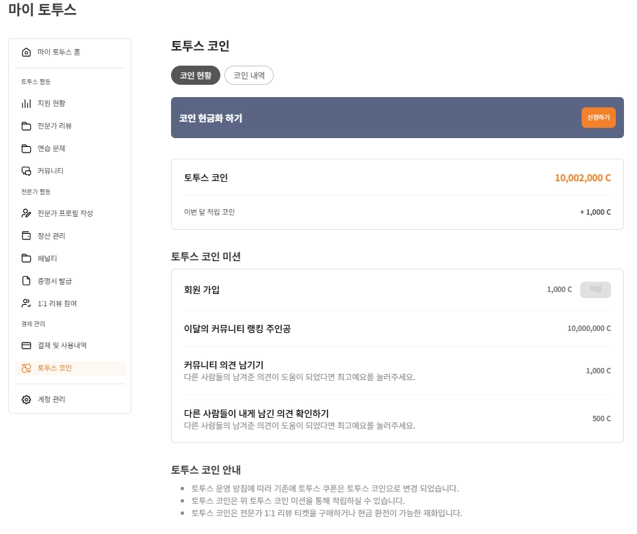 토투스 코인 : 토투스 코인은 현금 환전이 가능한 재화이며, 전문가 리뷰 티켓 구매 시에도 사용 가능합니다.
